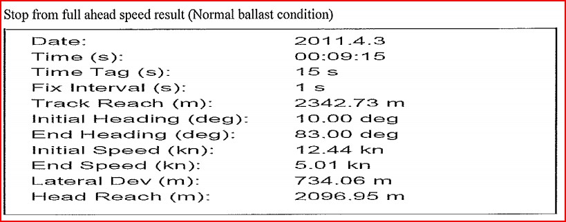 Stopping test to be carried out for full speed. The vessel runs ahead at M/E abt. 85%MCR (abt.124 rpm), when the ship speed and course are stable, give an order to stop. Stopping distance, stopping time and changing of course angle to be measured by DGPS from M/E stopping to the vessel speed which falls to 5 knots (shown on the log).